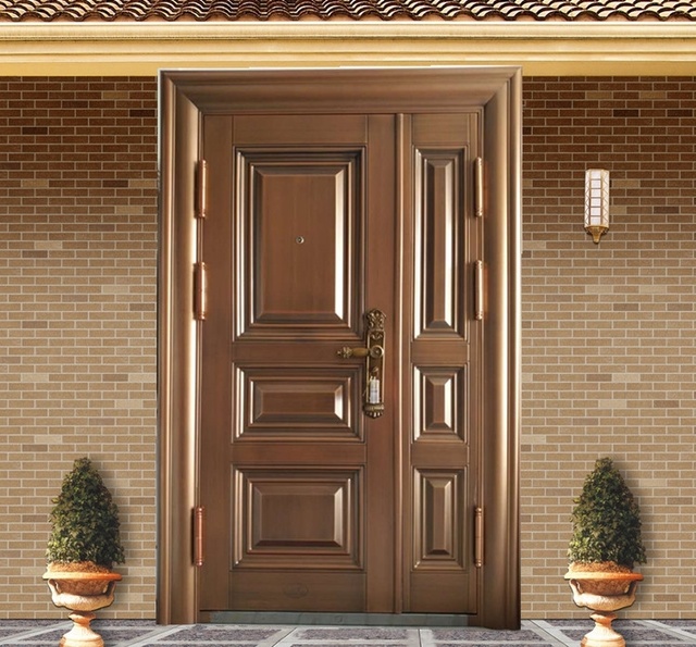 由于銅價(jià)格較為昂貴,除了真銅門(mén)也就是全部都用銅做的庭院大門(mén)外,還有玻璃銅門(mén),旋轉銅門(mén)和鋼銅門(mén),其中使用廣泛的是鋼銅門(mén),鋼銅門(mén)是以鋼結構為內部骨架,外面包裹銅面板材料,表面的鋼面板材料通常選擇易折彎,可塑性強,不易開(kāi)裂的紫銅。