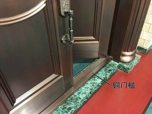 4. 門(mén)檻:是指門(mén)框下端的橫木條、石條或金屬條。銅門(mén)門(mén)檻高度一般是43mm。也可根據要求增減尺寸。這里一般,我們不建議業(yè)主選擇“銅門(mén)檻”,考慮到長(cháng)時(shí)間使用,容易“踩花”表面,影響美觀(guān)。